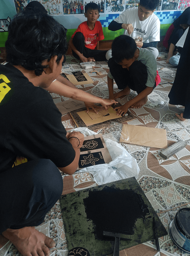 Sirojul, dengan sabar menjelaskan teknik menggambar terbalik pada media cukil. Untuk memudahkan anak-anak, ia meminta peserta menggambar objek sederhana seperti daun atau bunga. Ia juga mencontohkan cara mencukil yang aman, dengan tidak meletakkan tangan di depan mata pisau cukil yang tajam.