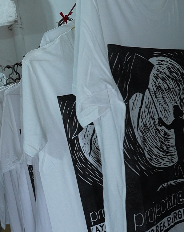“Kami mulai kenal dari lapak di Taman Bungkul. Saat itu, saya jual emblem bordir, lalu melihat banyak yang datang dan cuma menunggu saya jualan, saya berinisiatif membuat workshop cukil di sana,” ujar Dimas.