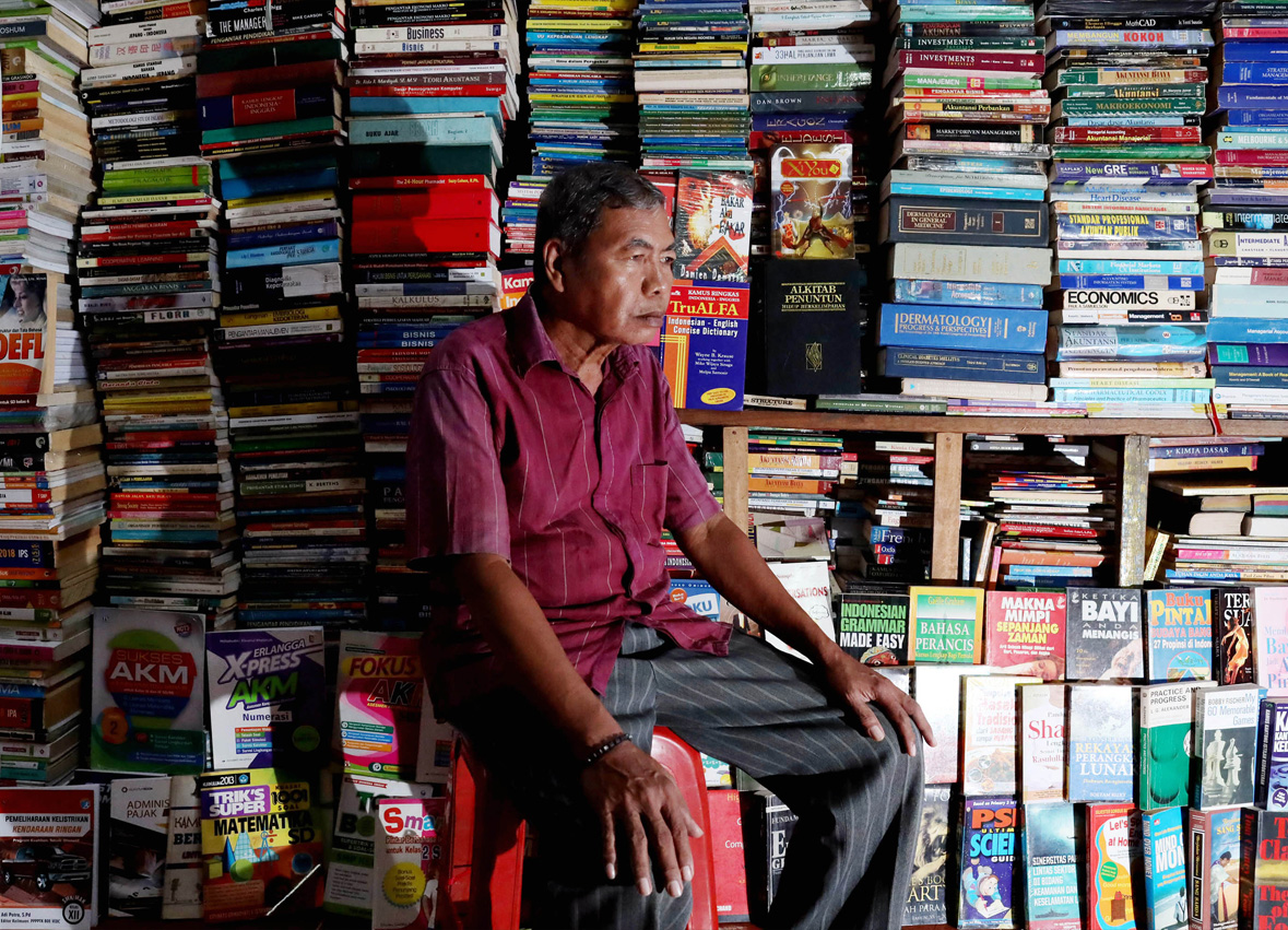 Potrait Yahman (75) di lapak miliknya. Penjualan online mengakibatkan buku-buku di stan miliknya sepi peminat. Robertus Risky/ Project Arek