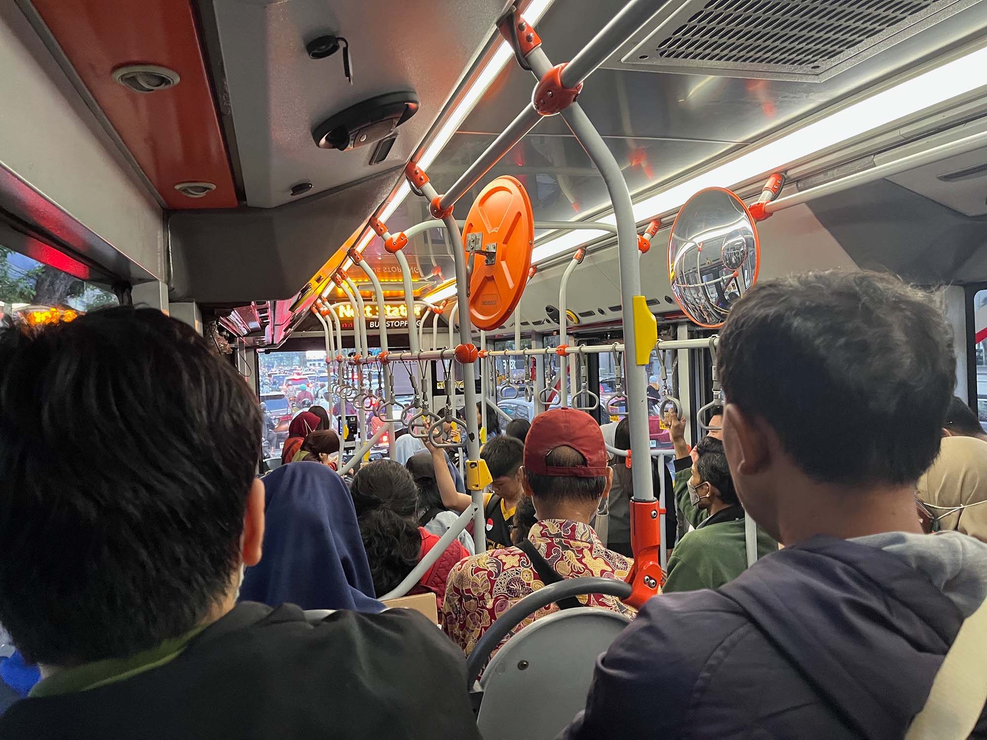 “Emang traffic-nya kalau hari Senin sama Jumat itu rame, sih,” kata Revadhiya datar. Rencananya, ia berniat menumpang bus menjejal macetnya Raya Darmo, lalu turun di Halte RSAL untuk melanjutkan perjalanan ke indekosnya di Gunung Anyar, sedangkan Cantika hendak ke Bungurasih untuk lanjut ke Tulangan, Sidoarjo, dengan bus Transjatim.