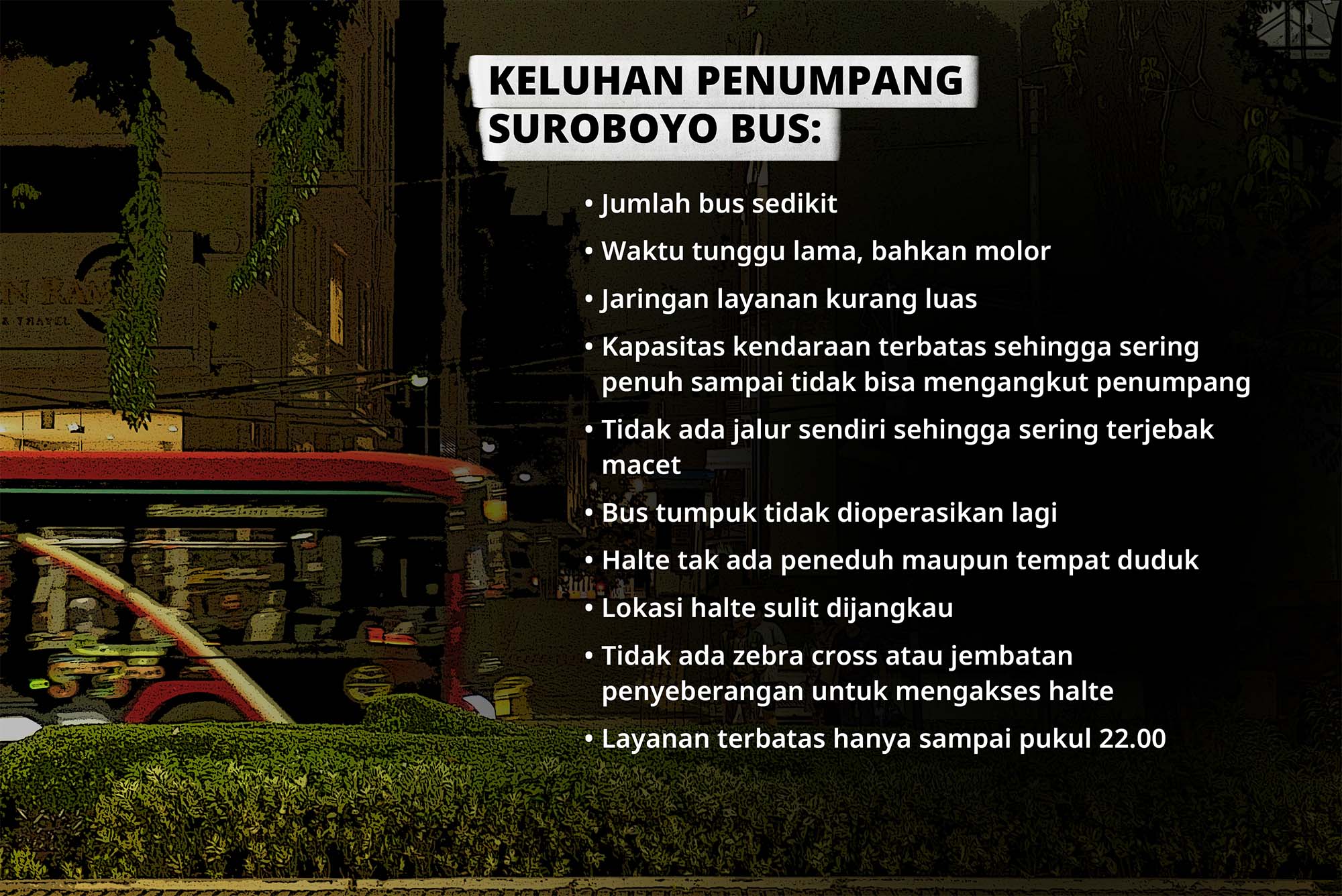 Cantika dan Revadhiya adalah dua dari sekian banyak warga yang pernah atau bahkan masih kerap dikecewakan Suroboyo Bus. Pasalnya, setelah delapan tahun beroperasi, jaringan bus di Surabaya—kota terbesar di Indonesia mengingat Jakarta berstatus provinsi—hanya terdiri dari empat trayek bus dan 11 rute pengumpan atau feeder.
