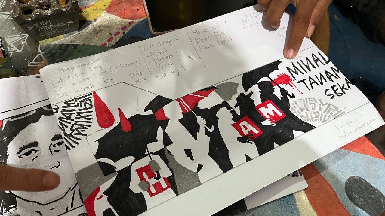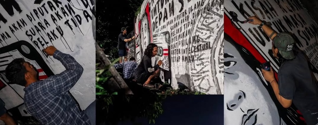 Mural itu adalah hasil kerja empat seniman yang lebih suka dikenal dengan nama jalanannya: Revolt, Smock, Sin, dan Deadnow. Mereka tergabung dalam Serikat Mural yang punya gerakan bernama Street Art Melawan. Tujuannya adalah menyuarakan berbagai isu politik serta mengekspresikan solidaritas bagi sesama warga sipil, termasuk apa yang dialami Andrie Yunus.