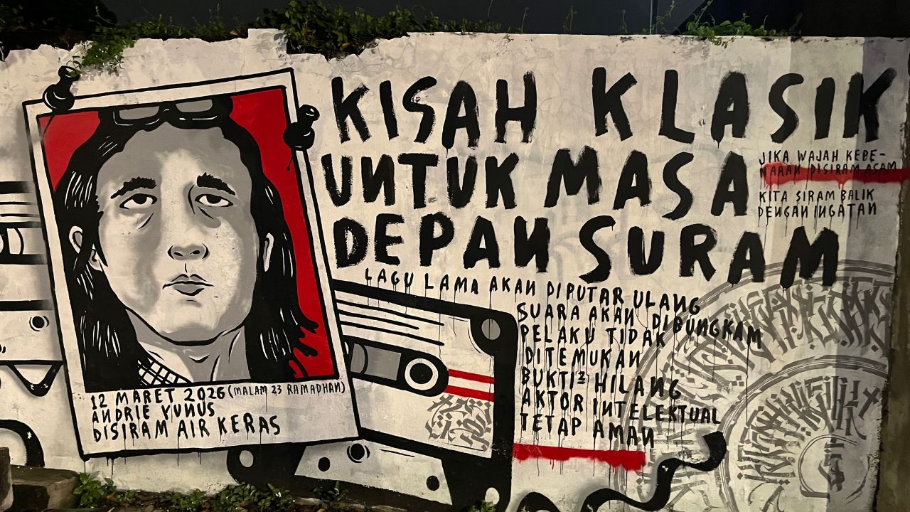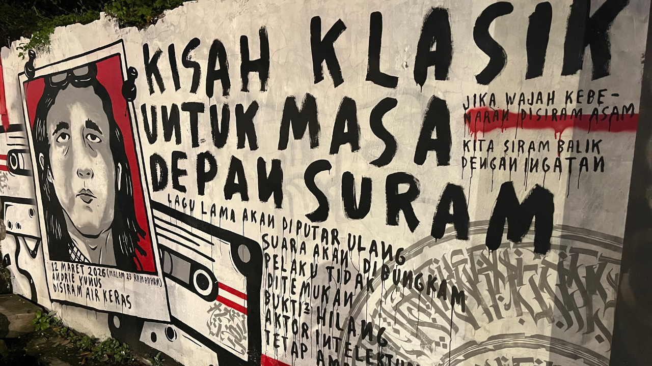 Karya tersebut menampilkan lukisan wajah Andrie Yunus dalam bingkai kertas foto polaroid berlatar merah. Judulnya ditulis besar-besar: Kisah Klasik untuk Masa Depan Suram. Di bawahnya, tertera bait-bait yang seolah meramalkan ujung dari pengusutan kasus teror ini oleh aparat penegak hukum:
