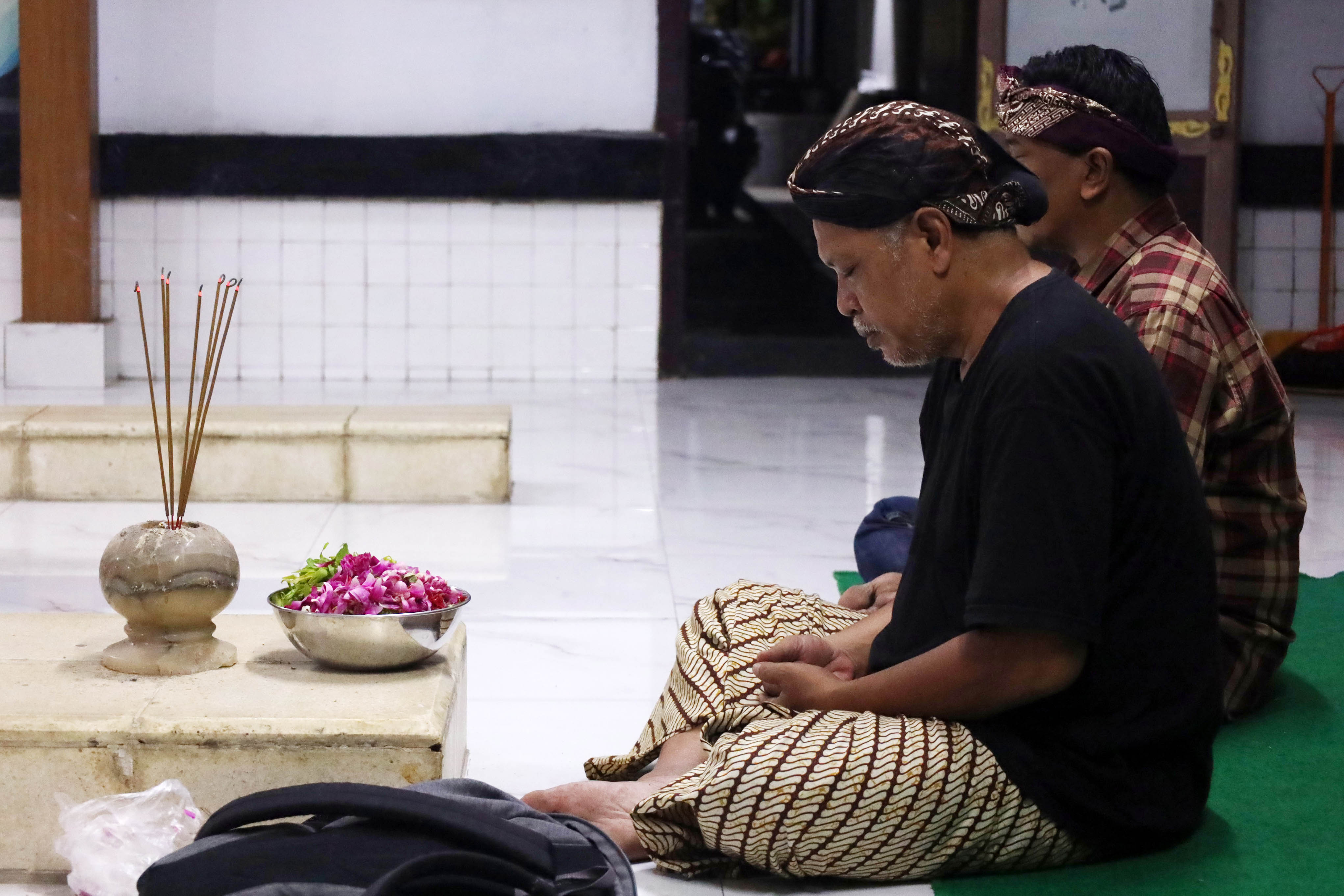 “Hong wilaheng prayoganira manembah mring para Hyang Ingsun miwiti kanti resiking sukma, icalna samubarang kang awon Pangestuning para Hyang Jagat buwana langgeng,” ucapnya, “Hooonggg… Hooonggg… Hooonggg…”. Wangi dupa yang disulut Tjahja mulai meliuk di sela-sela rongga hidung saya. Sekitar 20 menit lamanya ia menuntaskan semedinya. Sejurus kemudian, ia mengemas kembang empat rupa ke dalam kantong plastik ukuran kecil untuk dibawa pulang.
